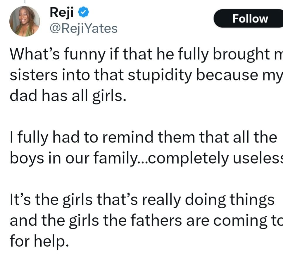Woman reveals how her five female cousins reacted after their father said a man with all girls has no children