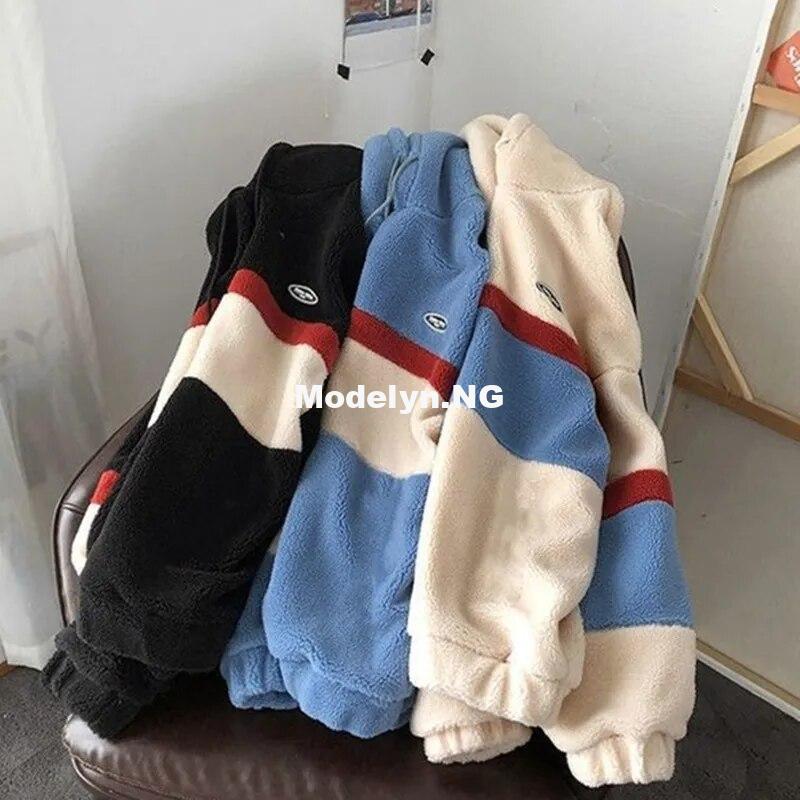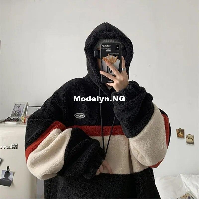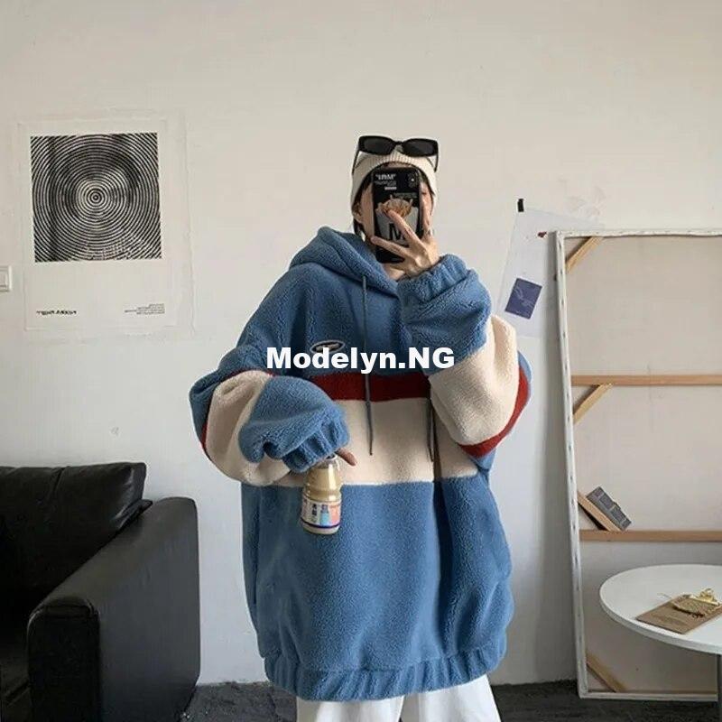 Japanese and Korean Style Fashion Fleece Hoodies Men's Splice Stripe Hooded Sweatshirt Men's Loose Coat Student Casual Top Pullo